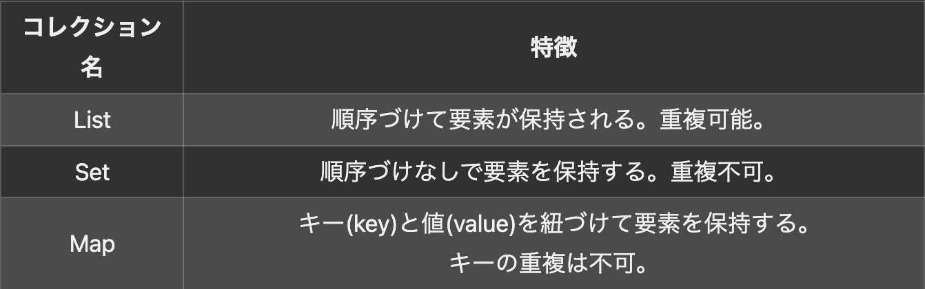 コレクションにはList、Map、Setの3種類あり、それぞれ以下のような特徴があります。