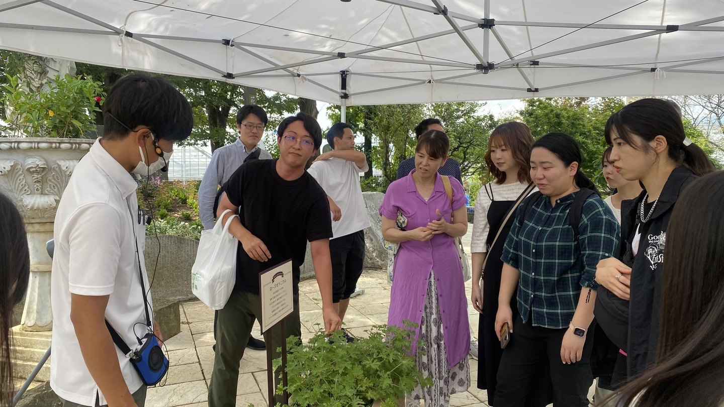 ガイドさんの説明に耳を傾けながら、ハーブの香りに癒されるひととき。特にハーブエキスを使った化粧品には、女性スタッフが興味津々でした。
