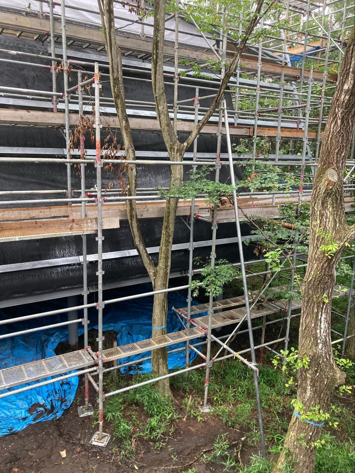 SANUに入社して最初のプロジェクトは「那須1st」の現場だった。那須連山がそびえ、広葉樹林が広がる森の中での拠点づくりだ。そこでは、既存の樹木を残しながら、木々の間を縫うように足場の掛け方を工夫して作業が進められた。