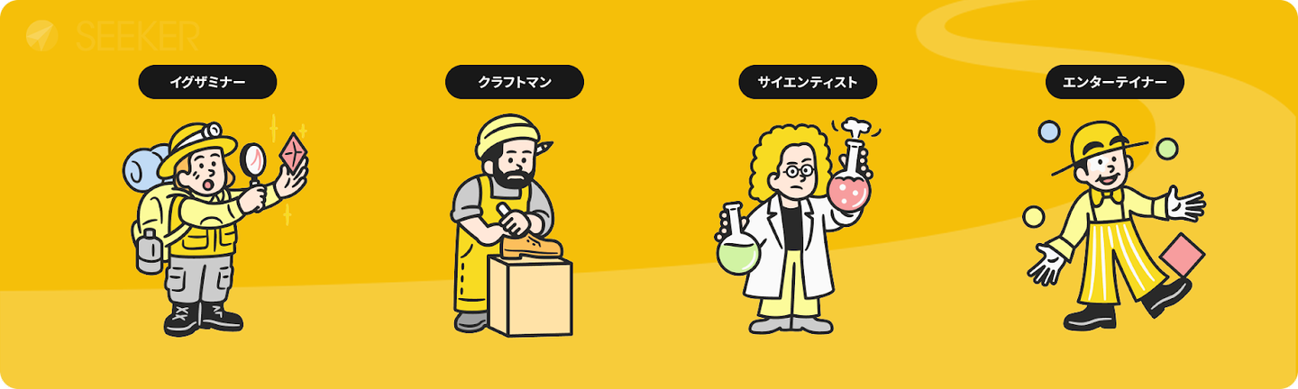 『Wantedly Assessment』は、仕事における思考や行動のクセをもとに、全16タイプ(4カテゴリ×4タイプ)の性格に分類し、可視化できる診断ツールです。