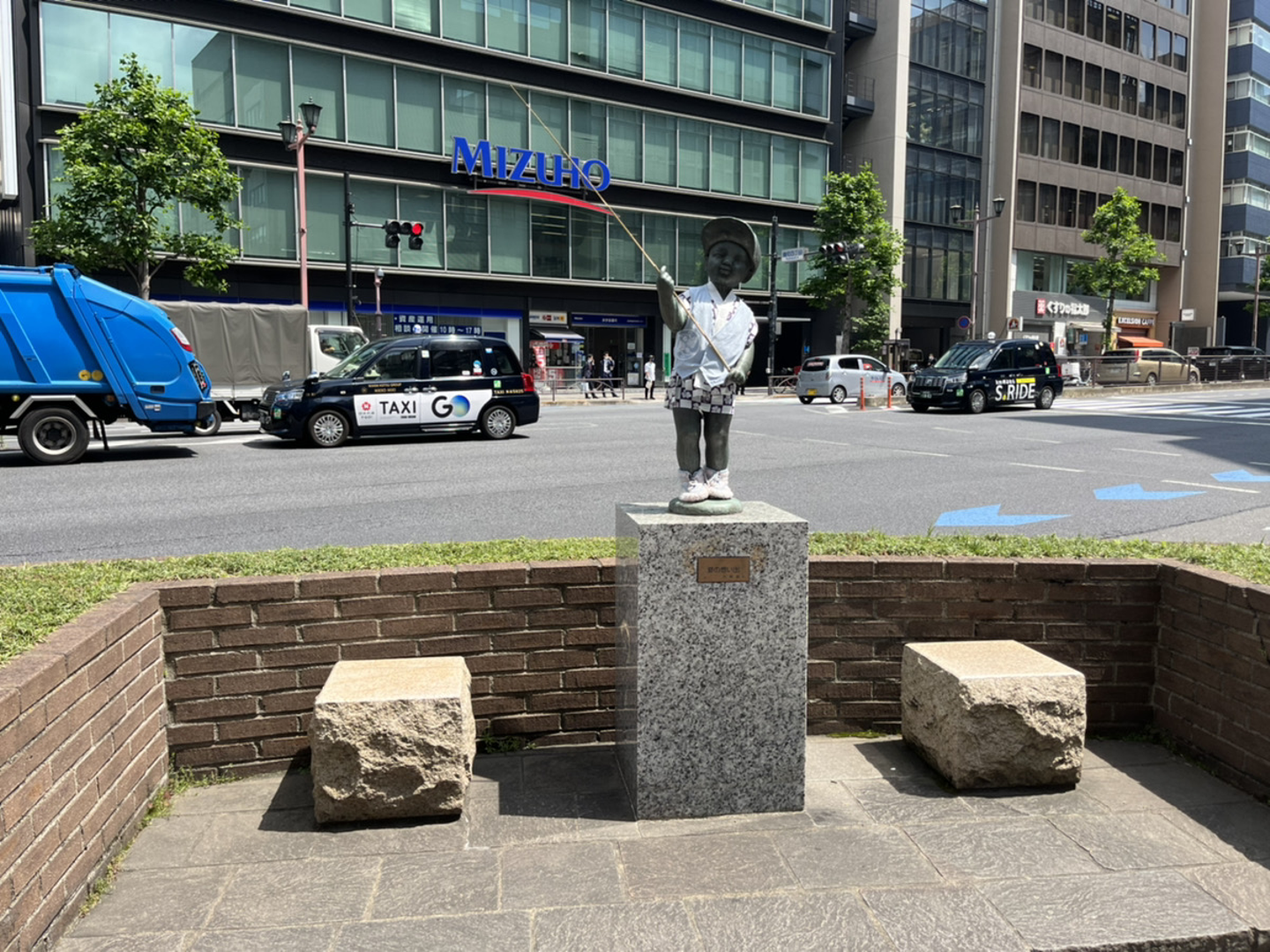 出口1を出たところに夏の思い出像があります♪この銅像は季節ごとなのか毎週のようにお着替えされていて、出勤時の楽しみにもなっています!ぜひ皆様がお越しの際もどんな洋服を着ていたかを教えてください♪この日は何でしょう?!釣りをしているのでしょうか?
