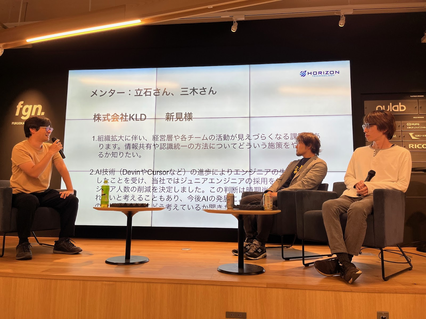 メンティーの方1人にメンターが2人付き、アドバイスをする形式でした。