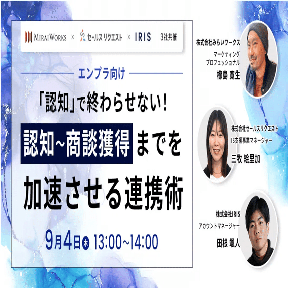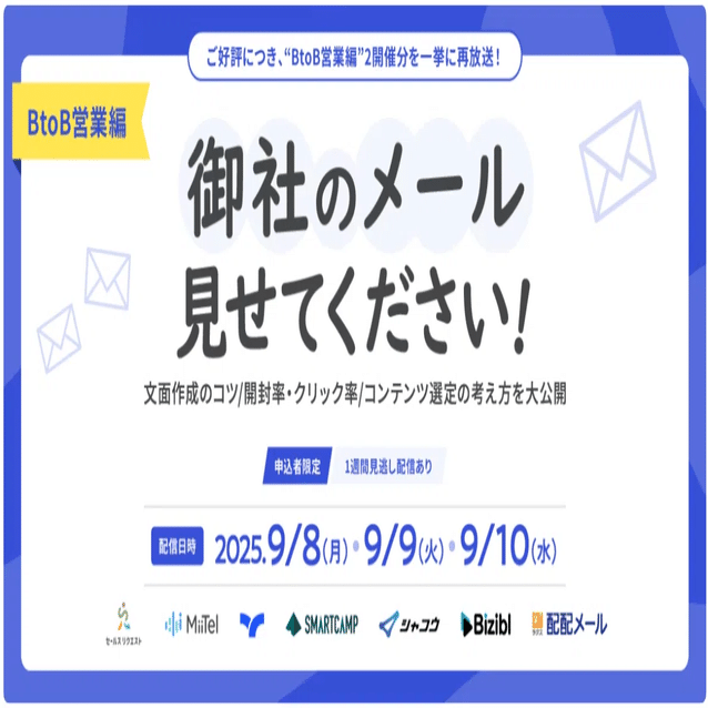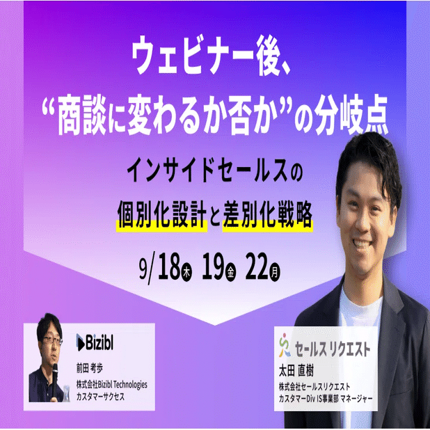 2025年9月18日(木)・19日(金)・22日(月)、Bizibl様が主催する「9月のインサイドセールス×ウェビナー強化月間」との連動企画に弊社のカスタマーdivマネージャー・太田が登壇いたしました。