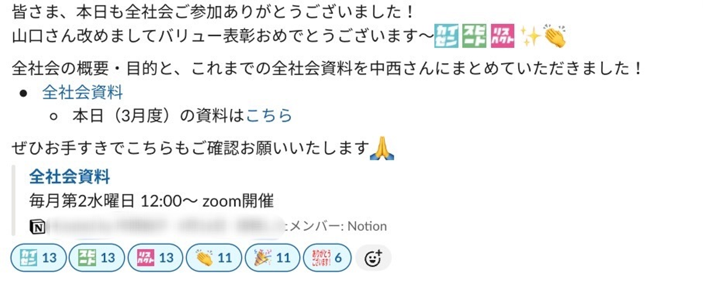 また、毎月「最もバリューを体現した社員」を称える「バリュー表彰制度」を導入しました。これは、日々の業務の中でつい見過ごされがちな「良い行動」や「仲間への思いやり」をきちんと形にして、メンバー同士で伝え合いたいという思いから始まったものです。例えば最近では、バリュースタンプの作成を自ら提案した社員や、積極的に業務に取り組む姿勢があり、社内外から評価されているメンバーなどが表彰されています。