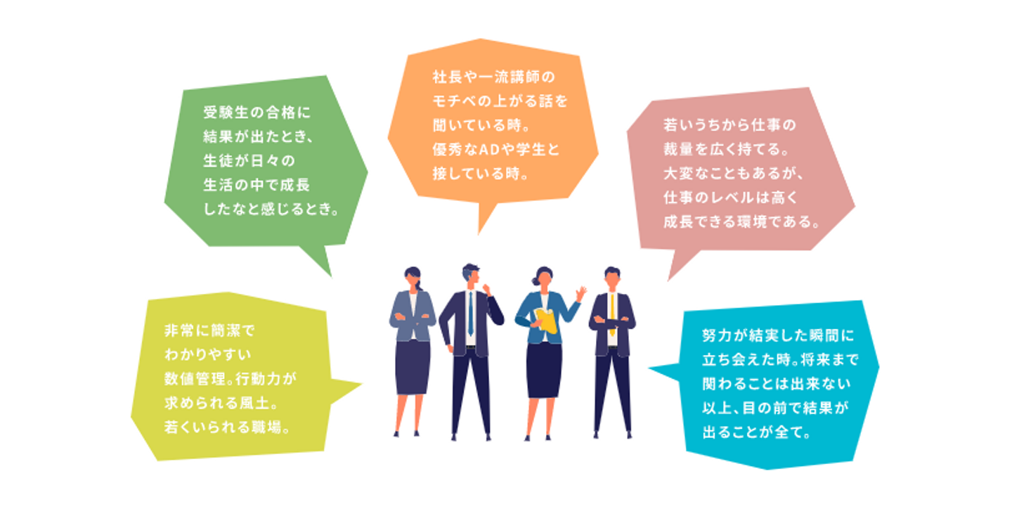- A.前職は技術系の派遣会社の営業をしていました。自分自身が成長できる他業種を探していましたが、高校生を第一志望校合格のため指導・導いていくことに惹かれ、人材派遣業界のノウハウも活かせると考えました。