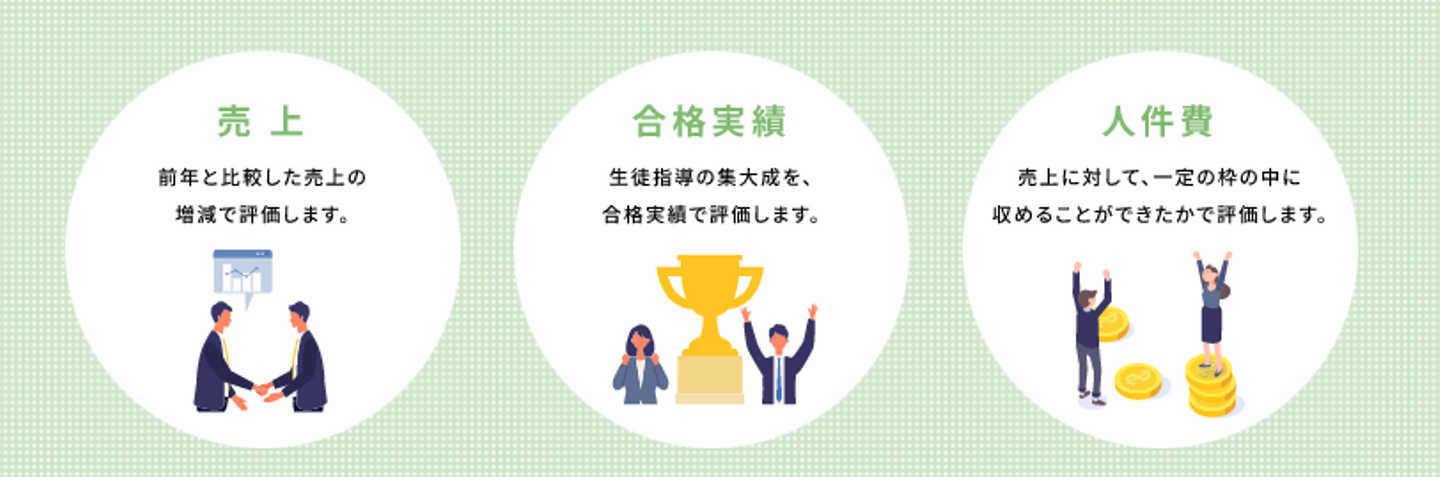 1年間の業績(売上・合格実績・人件費)が翌年の年俸に反映されます。