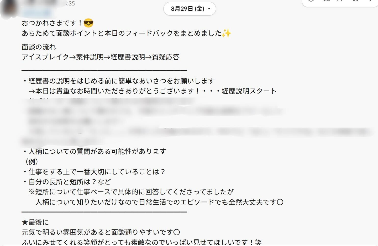 強みやアピールポイントを一緒に整理し、「質問事項」や「面談でのポイント」を確認。「自信を持って挑める」状態を一緒に作り上げていきます!