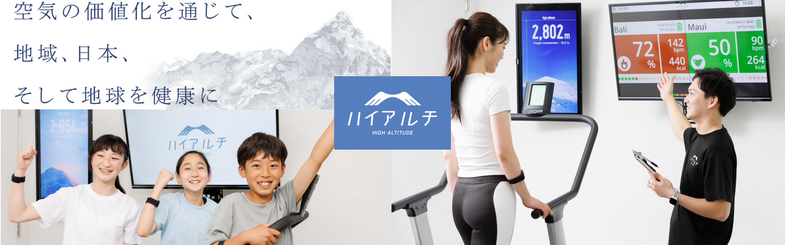 「高地トレーニングを、日常に―」を掲げて、トップアスリートを支えてきた高地トレーニングを、一般ユーザーのご支持のもと、全国70拠点以上に提供し、「低酸素」という健康によい空気を届けてきました。 私たちは「空気で健康をつくる」という新しいウェルビーイング市場を創造するヘルスケア・スタートアップ企業です。 その第一歩として、日本初の高地トレーニングスタジオ(低酸素フィットネスジム)「ハイアルチ」を全国展開。 そして、今後は、フィットネスにとどまらない、ウェルネス分野での事業拡大を目指しています。