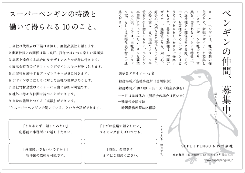 SUPER PENGUIN株式会社Followhttps://www.superpenguin.jp東京都FollowHomeAbout usMembersStoriesJob postings ペンギンの仲間、募集中。 eriko tamiya Other on 2024-09-19 当社は今、ペンギンの仲間を募集しています。ご興味のある方はぜひ、お気軽にご連絡ください。 SUPER PENGUIN株式会社's job postings ペンギンの仲間、募集中。 eriko tamiya SUPER PENGUIN株式会社 / Other Share
