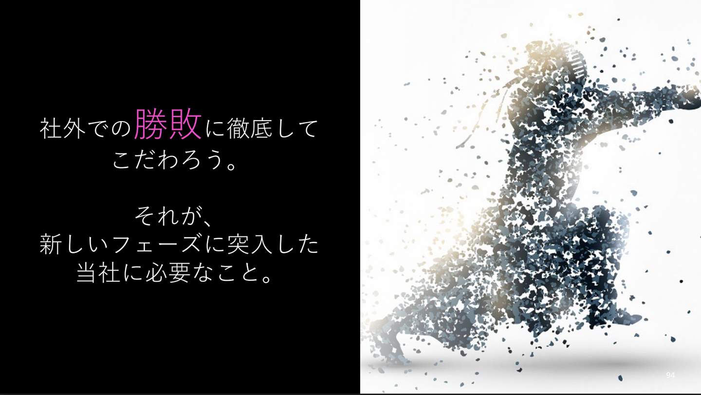 - 特に印象的だったのはこのスライド。「社外での勝敗に徹底してこだわろう。それが、新しいフェーズに突入した当社に必要なこと。」