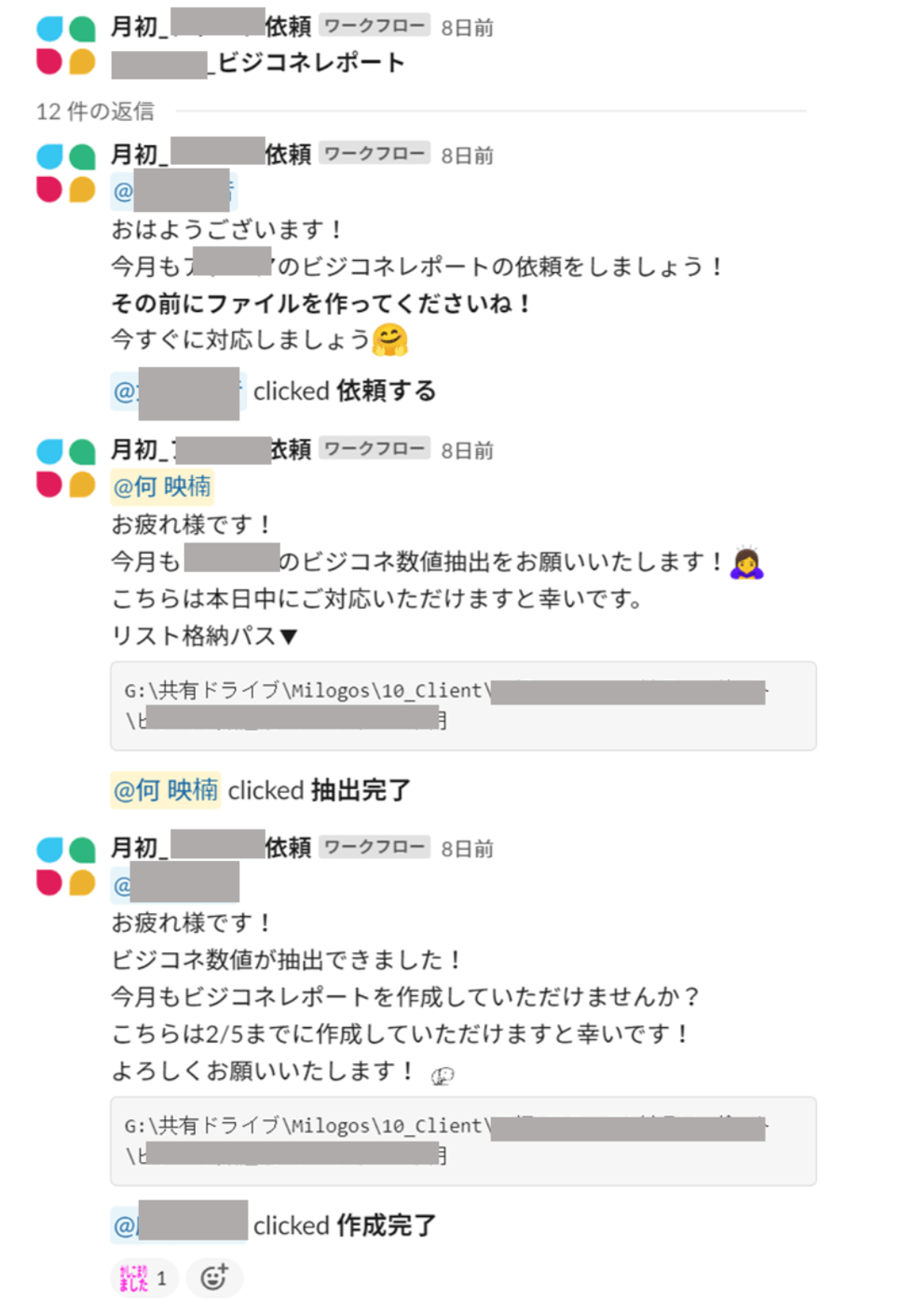 またSlack上で派遣さんと行われる定型のやりとりなども自動化し、「依頼する」「完了」のようなボタンを押せば、「確認お願いします」のような文章が出てくるようになりました。
