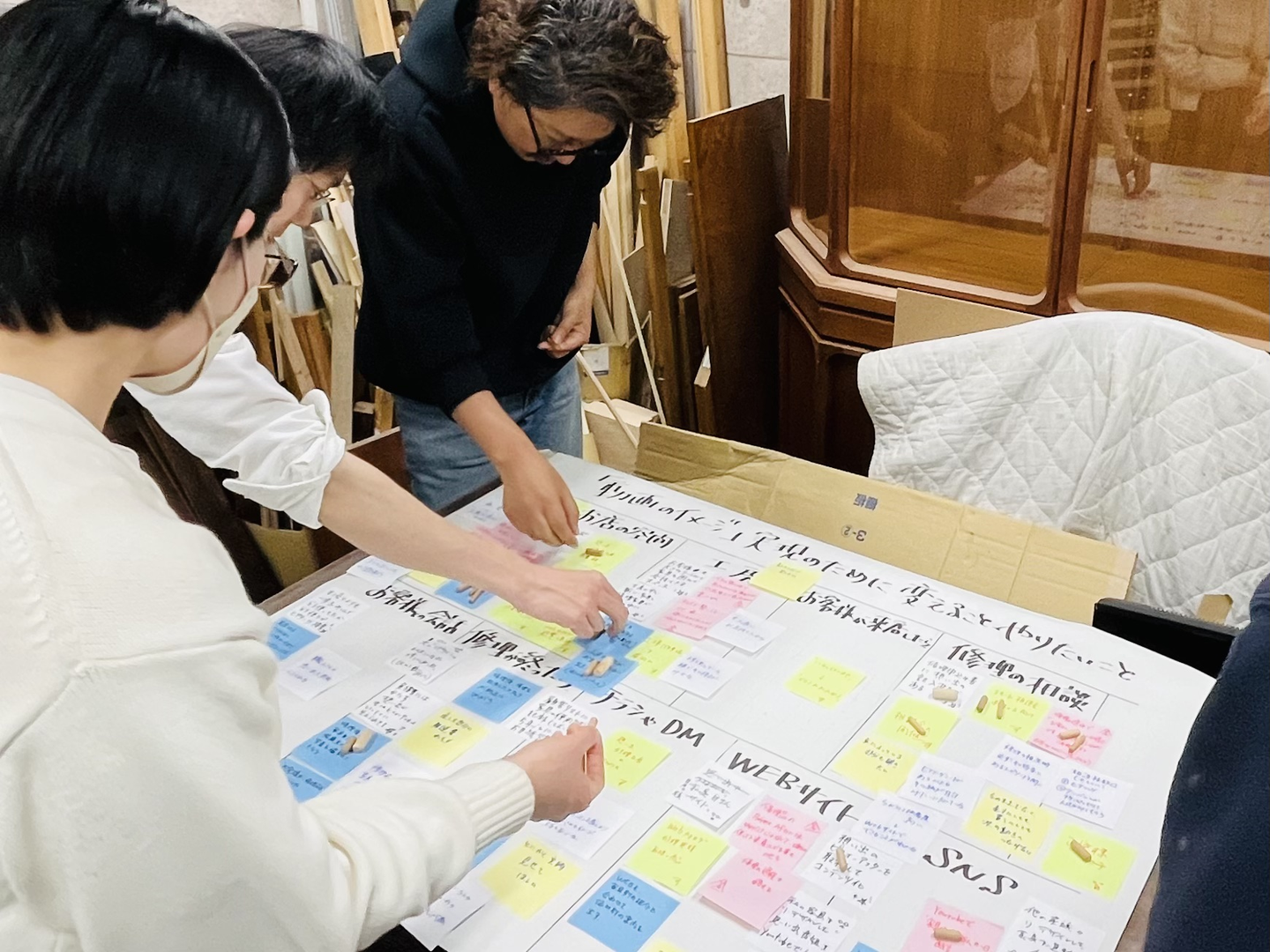 「MUNIものがたりらしい修理の請け負い方ってなに?」「ヒアリングのときには、想い出をしっかり聴こう」「ブランドサイトやInstagramには、お客様と家具とのものがたりをたくさん載せよう」「店内POPも、それぞれの家具のものがたりを伝えたい」…とにかく、アイデアを出して実行あるのみ!