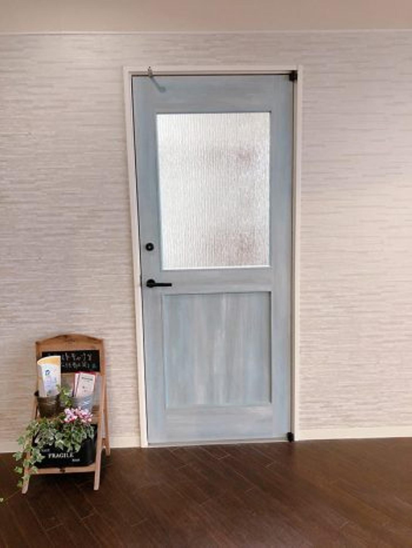 ドアは水色の木目調でカフェのような雰囲気になっています。