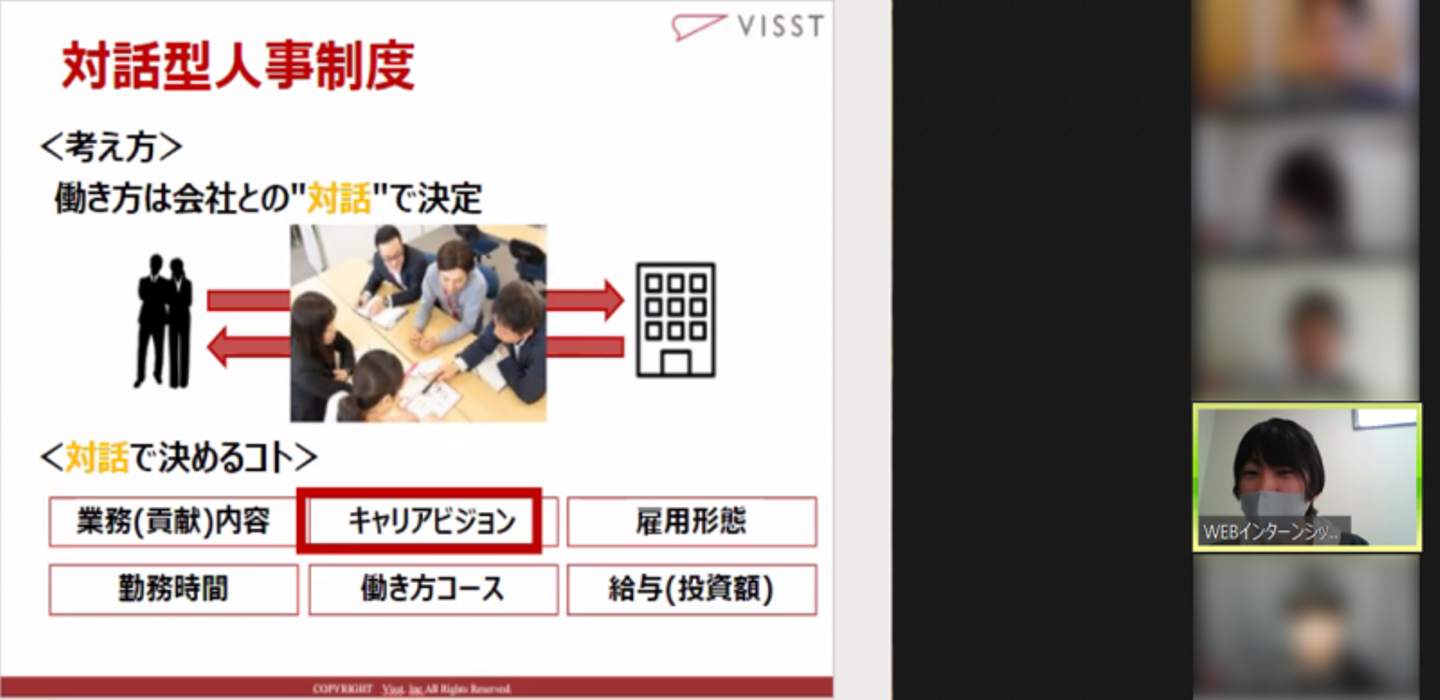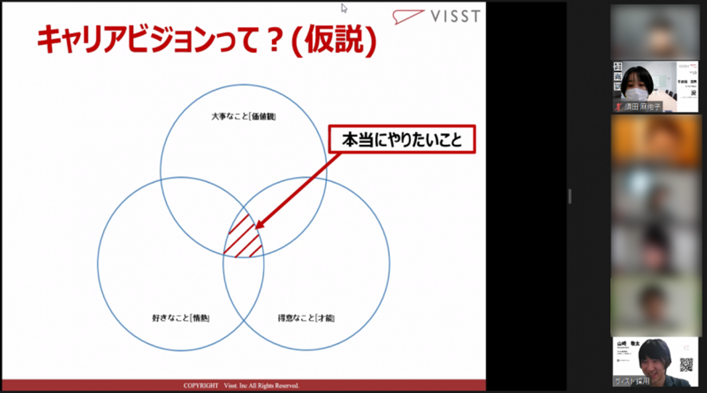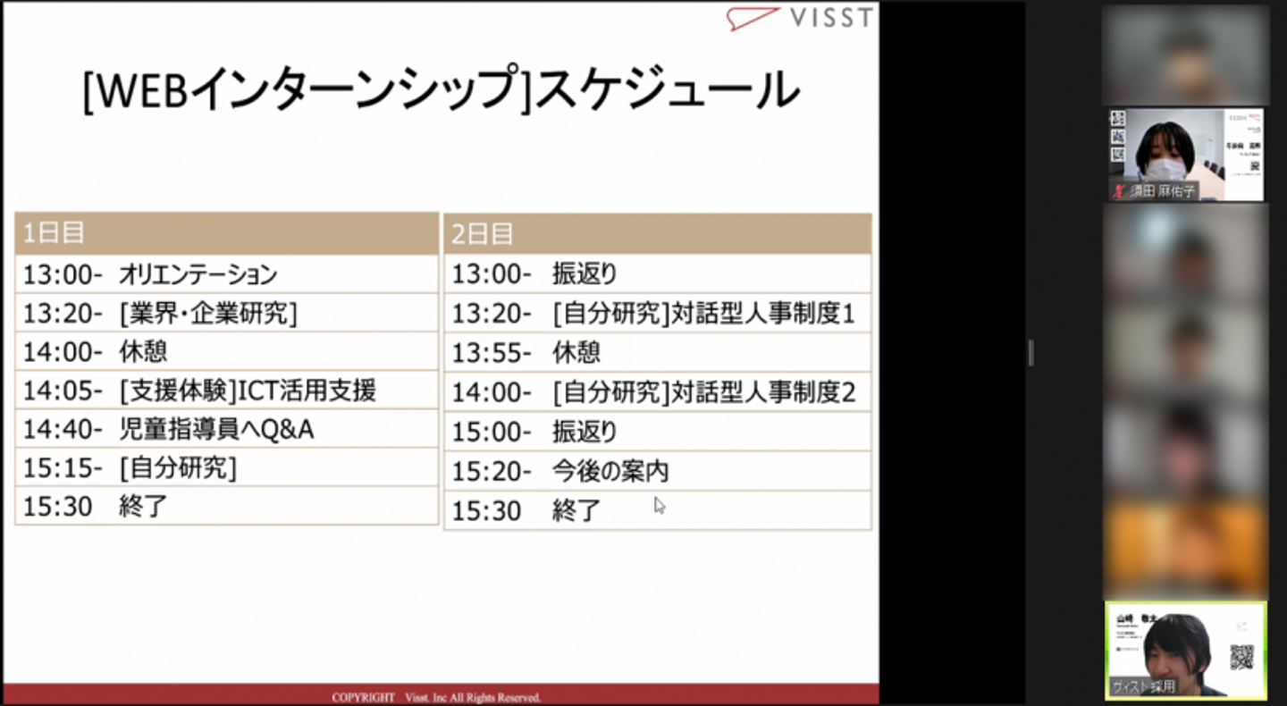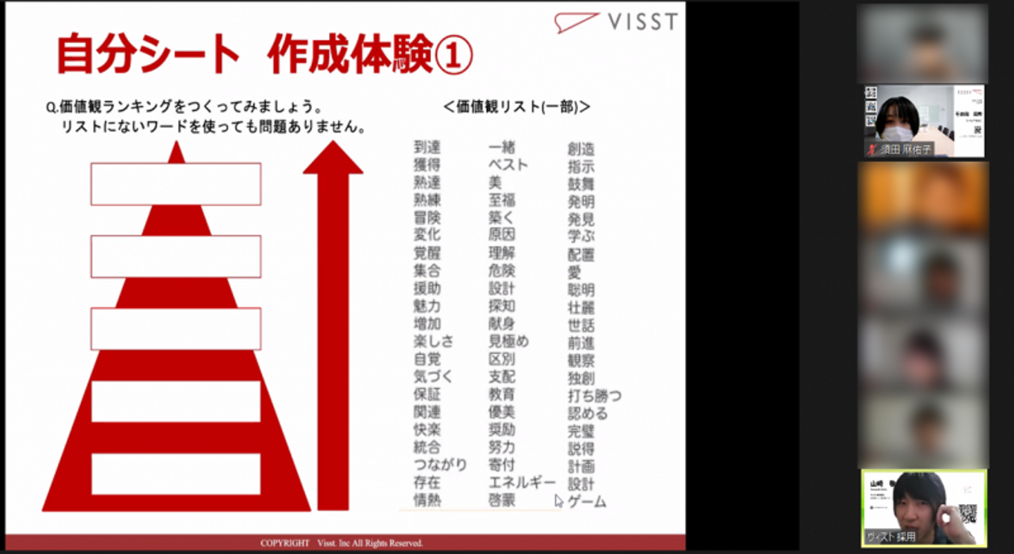 今回のWEBインターンシップの特徴でもありますが、ヴィストの仕事を体験していただくほかに、自分のことを見つめていただく時間を設けました。