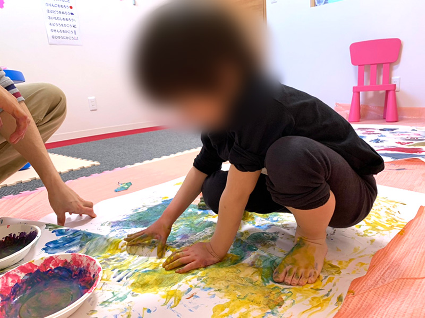 フィンガーペイントでは絵の具の匂いや、冷たさ、柔らかさ、色の変化など、五感を使ってたくさんのことを楽しむことができます。
