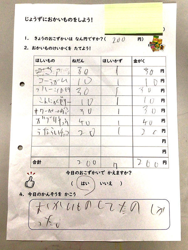 買うものと金額を考えながら、プリントに記入します。