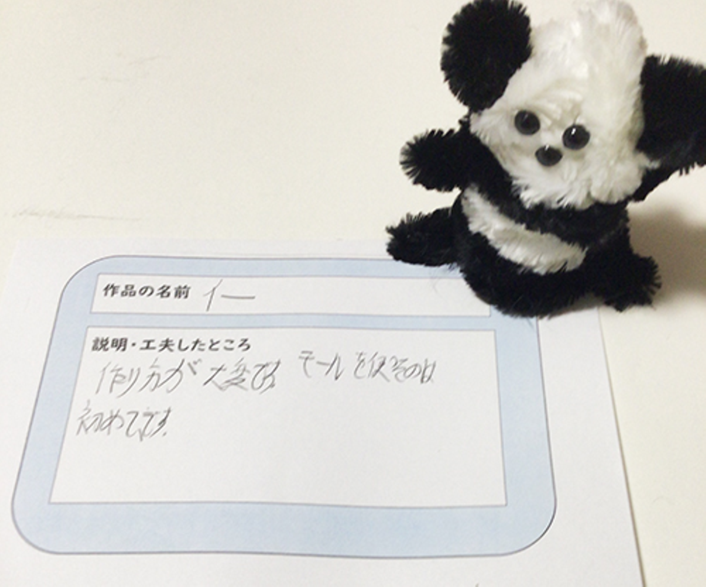 スタッフと一緒に手順書を見ながら、芯にくるくるモールを巻き付けて、パンダの身体や頭を作っていきます。
