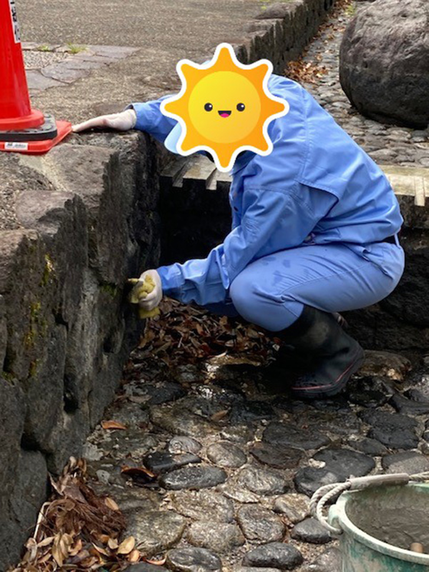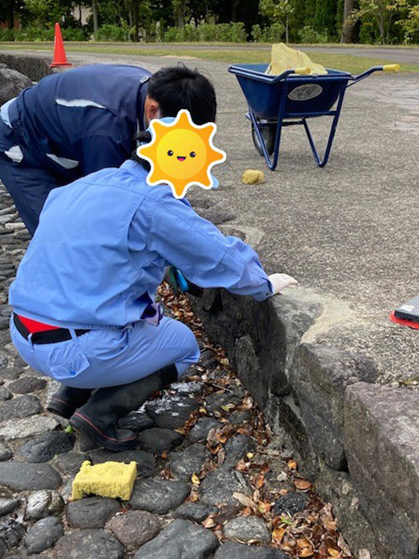 野上緑化の長谷川さんが石垣の間にセメント塗装を行い、はみ出したセメントをブラシやスポンジなどで磨く作業です。