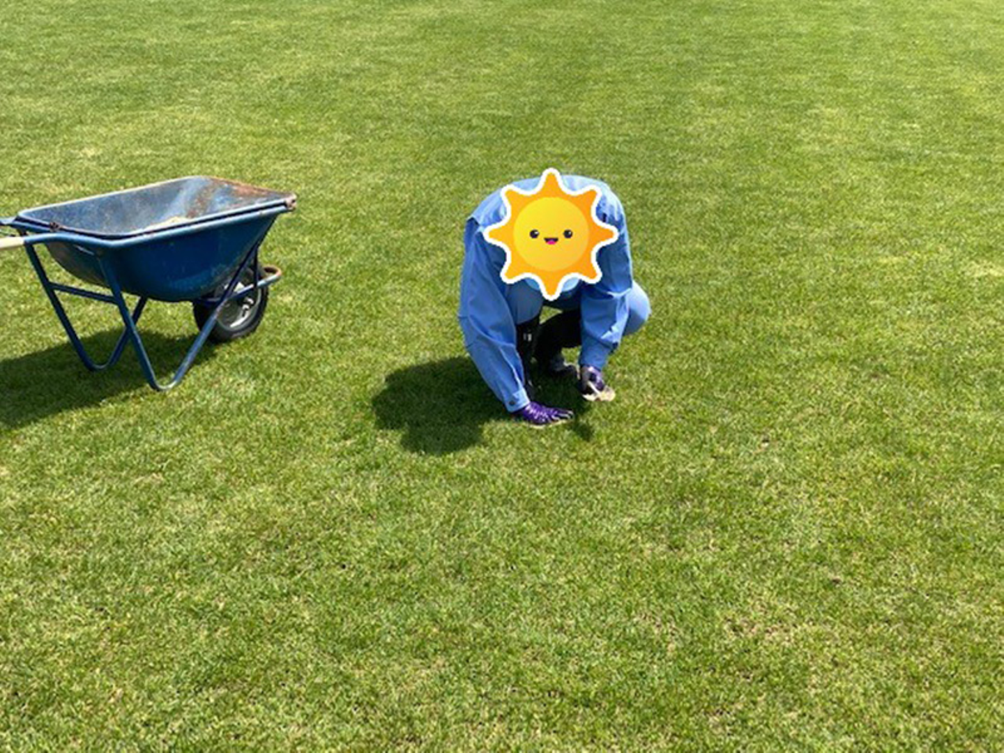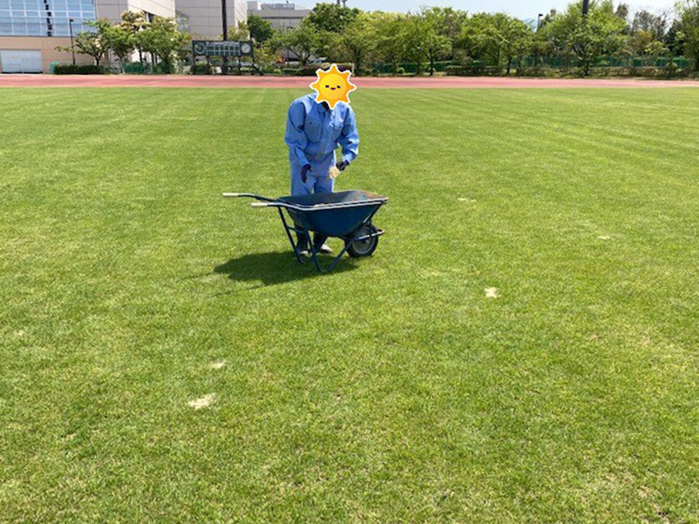 2日目は陸上競技場の芝生の補修作業を行いました。芝生のデコボコを埋める作業です。
