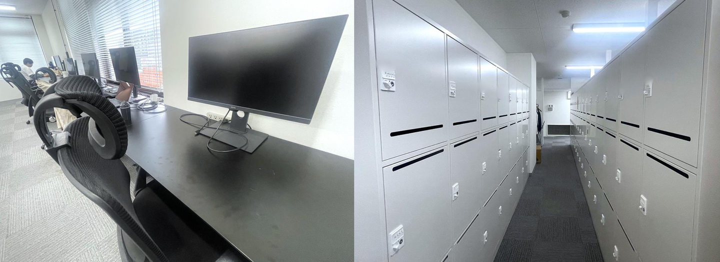 各自、会社支給のノートパソコンで仕事をしていますが、フリーアドレスである8階の各デスク・テーブルには、大きめのモニターも設置。デザイナーやエンジニア、Webコーダーの皆さんも、制作・作業しやすいように環境を整えています。個人の私物など、会社に置いておきたいものは個人ロッカーで管理しています。