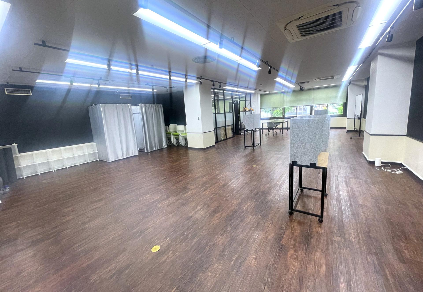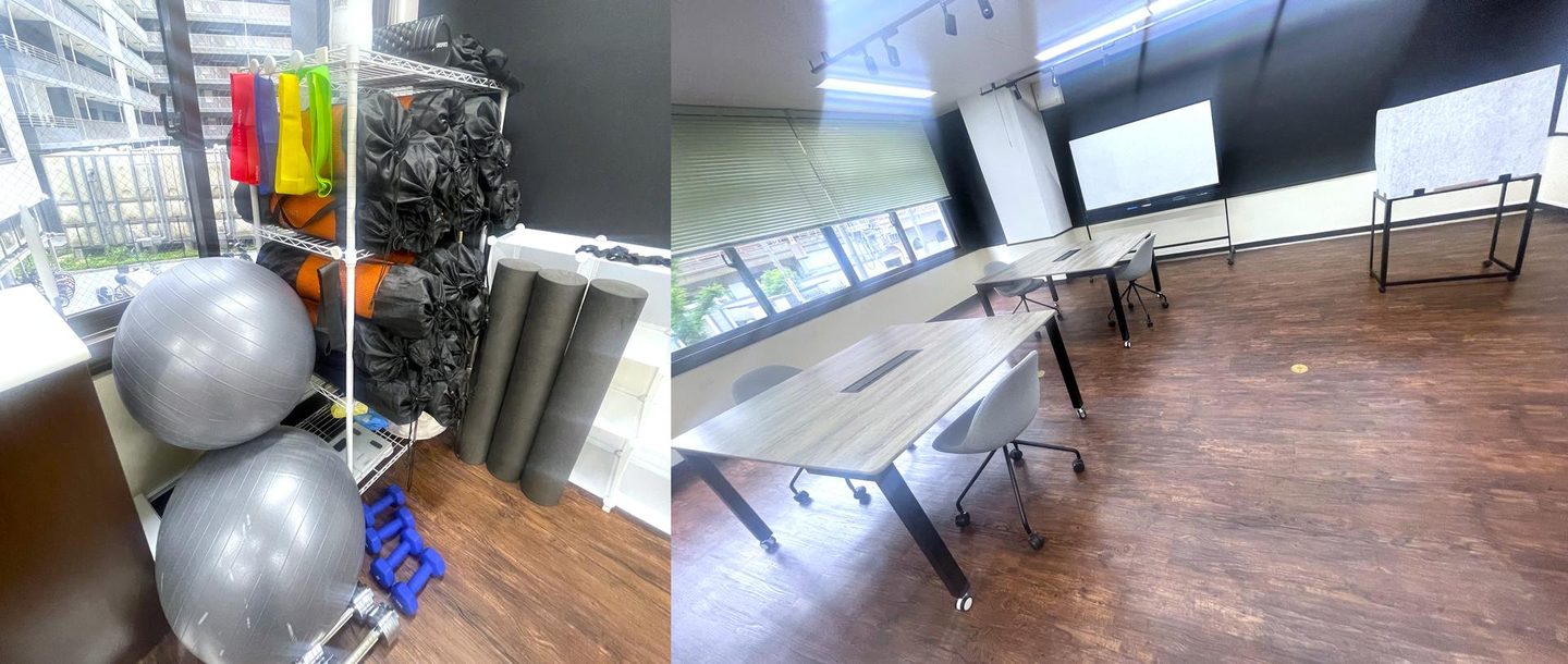部屋の奥にはトレーニンググッズがたくさん。またトレーニングが行われていない時は、MTGや研修で使ったり、会社説明会の会場にもなったりする便利なスペースなんです👌✨