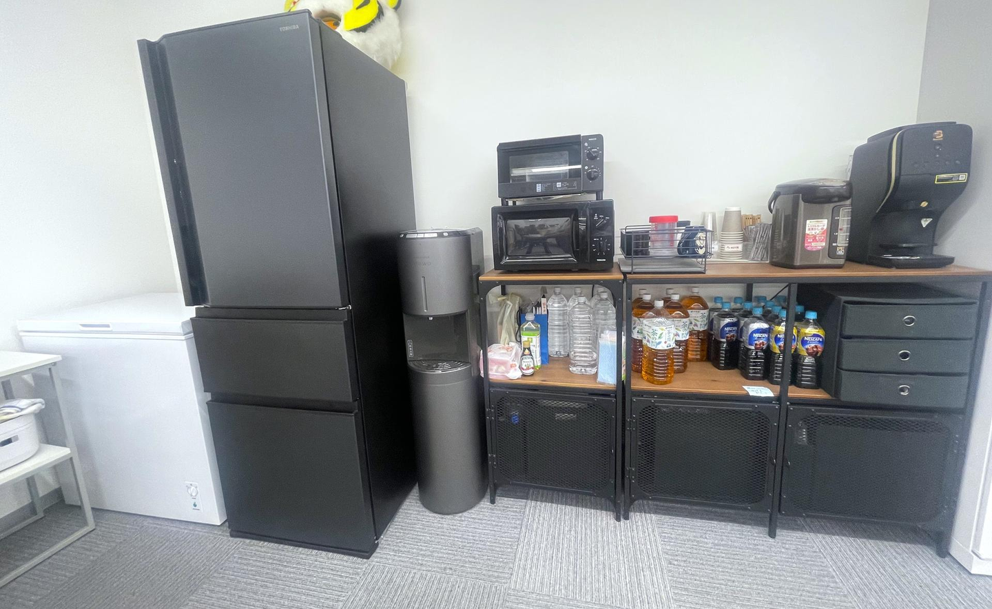社員は飲み放題のコーヒーなどの飲料スペース、冷蔵庫・レンジなども常備していますよ☕