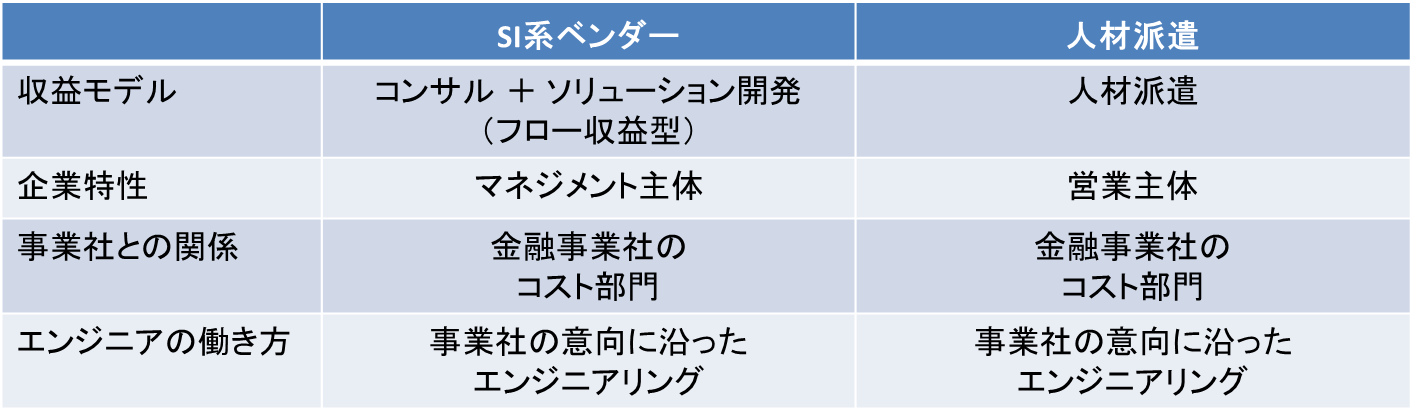 この状況下において、今後の金融ベンダーのビジネスモデルは大きく2極化すると考えられます。一つはSI系ベンダー。もう一つは人材派遣系のベンダーです。