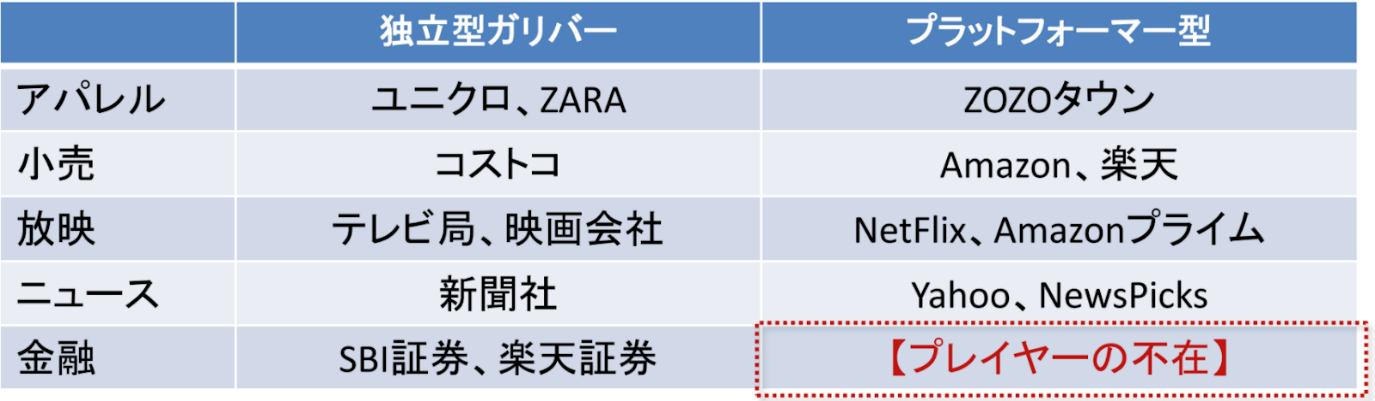 金融業界以外の業界に目を向けてみると、「独立型ガリバー企業」と「プラットフォーム型企業」にビジネスモデルが二分されています。