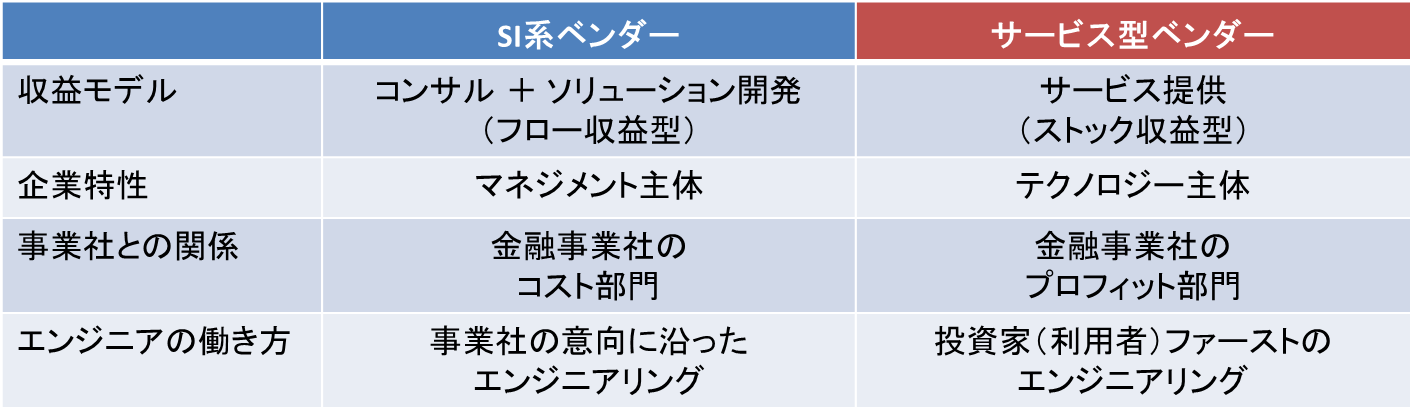 SI系ベンダーはいかにエンジニアが優秀で大きな利益を得られていたとしても俯瞰的に見ると、「金融事業者のコスト部門」であることは変えようがない事実です。
