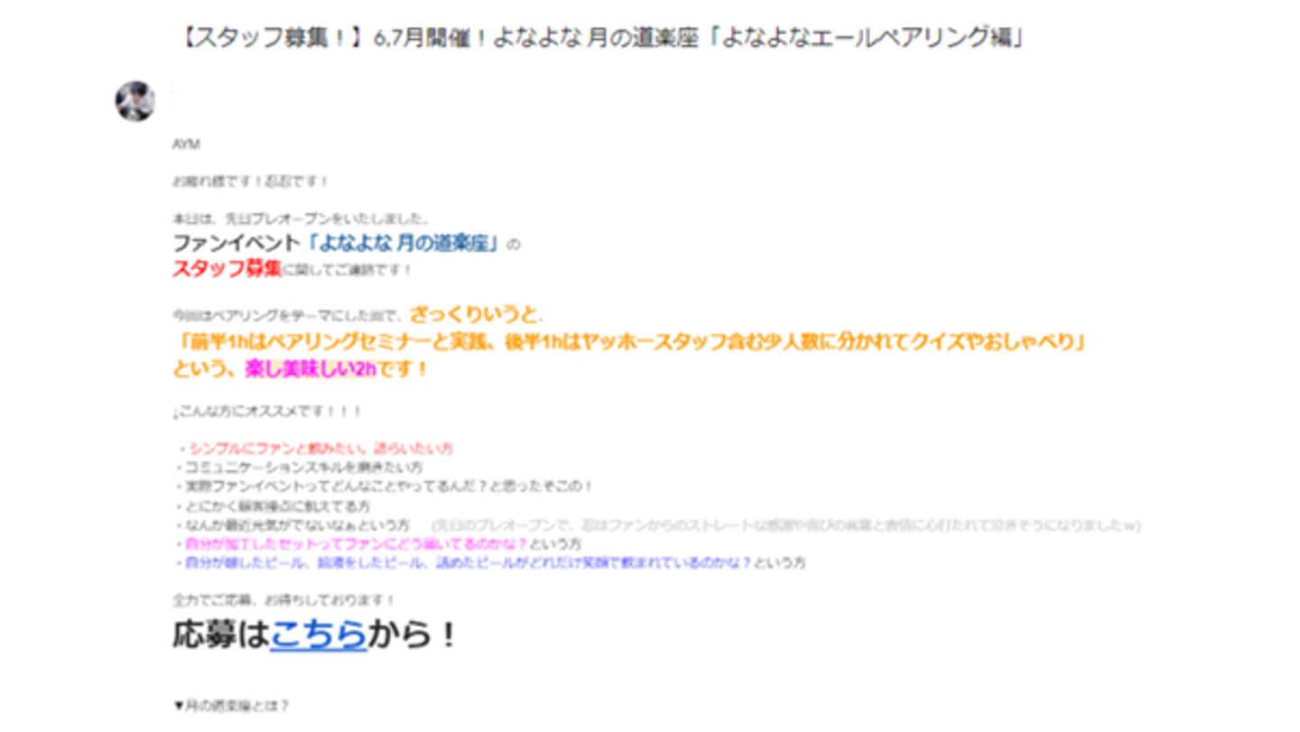 今回のように大きめのイベントの際には、全社から参加するスタッフを募ります。記念すべき「よなよな 月の道楽座」第一回の参加者募集メールも、いつものように届きました。