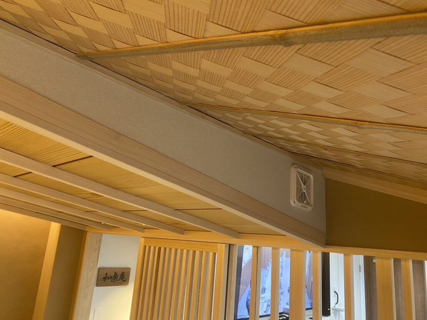 換気口も勿論見えにくい場所に設置するということで、勾配のある網代天井と杉の竿縁天井が接する場所に2つの天井の勾配の違いでできた空間を上手く利用し、畳に座られるお客様の目線からは殆ど目立たない位置に設置し、空気の流れ的にもいい場所を選定できたと考えている。