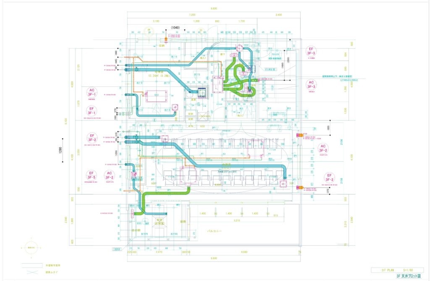 ① の解決策として、茶室のダクトが通るルートに会議室の倉庫をつくり、その倉庫を経由