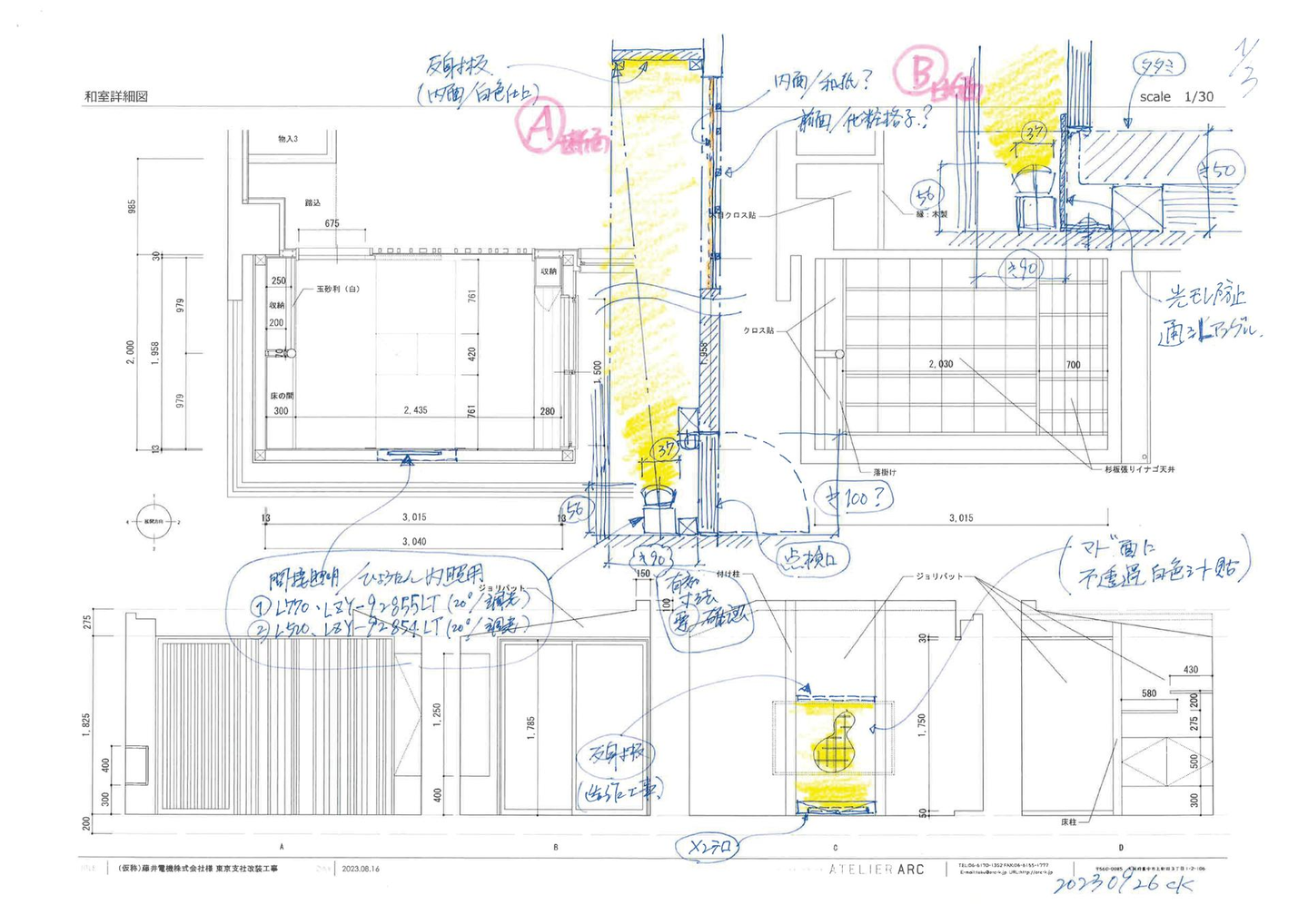 和天井(特に網代天井)に上手く器具の開口をすることに細心の注意を払い、時間と手間をかけて施工した。