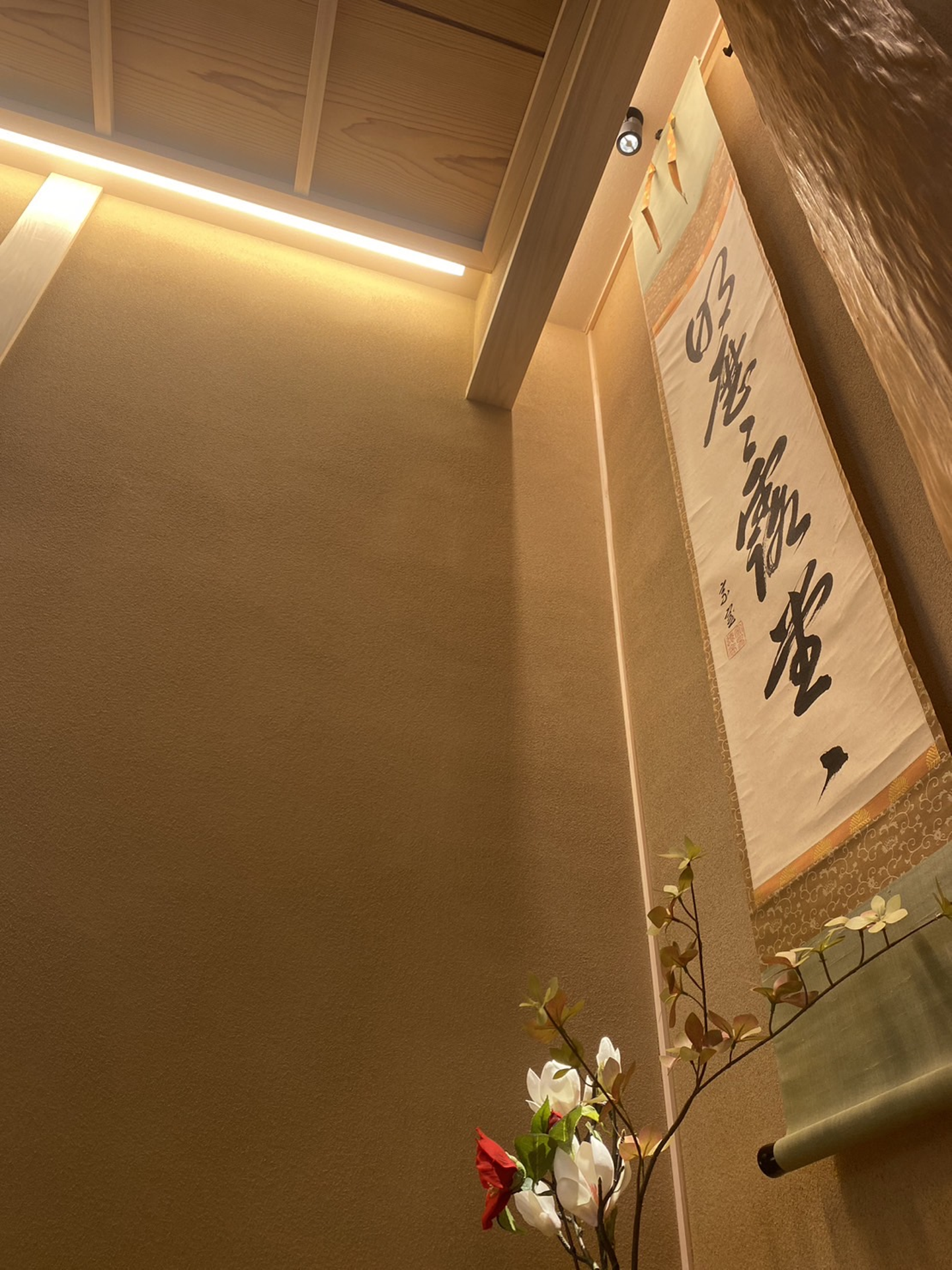 直接照明は、主に床の間の花器(床柱のかけ花入れ、置き花入れ)を照らす局所照明を間接照明の直横でお客様には見えない位置に仕込み、花や花器が最も綺麗に映し出されるように設置した。