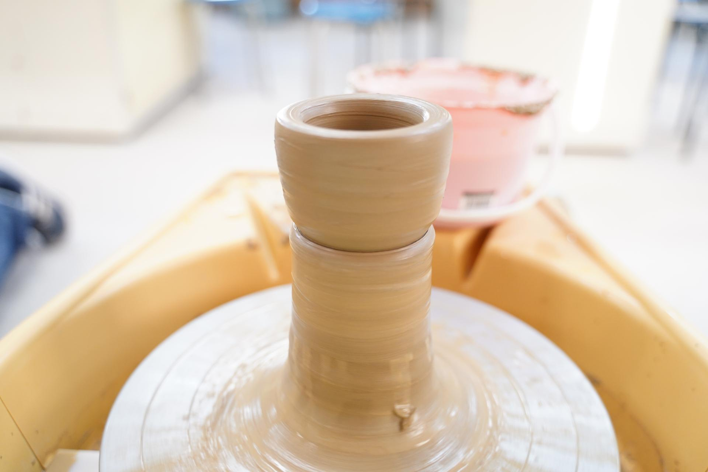 わくわくしながら電動ろくろを回し、まずは肝心の土台作り。