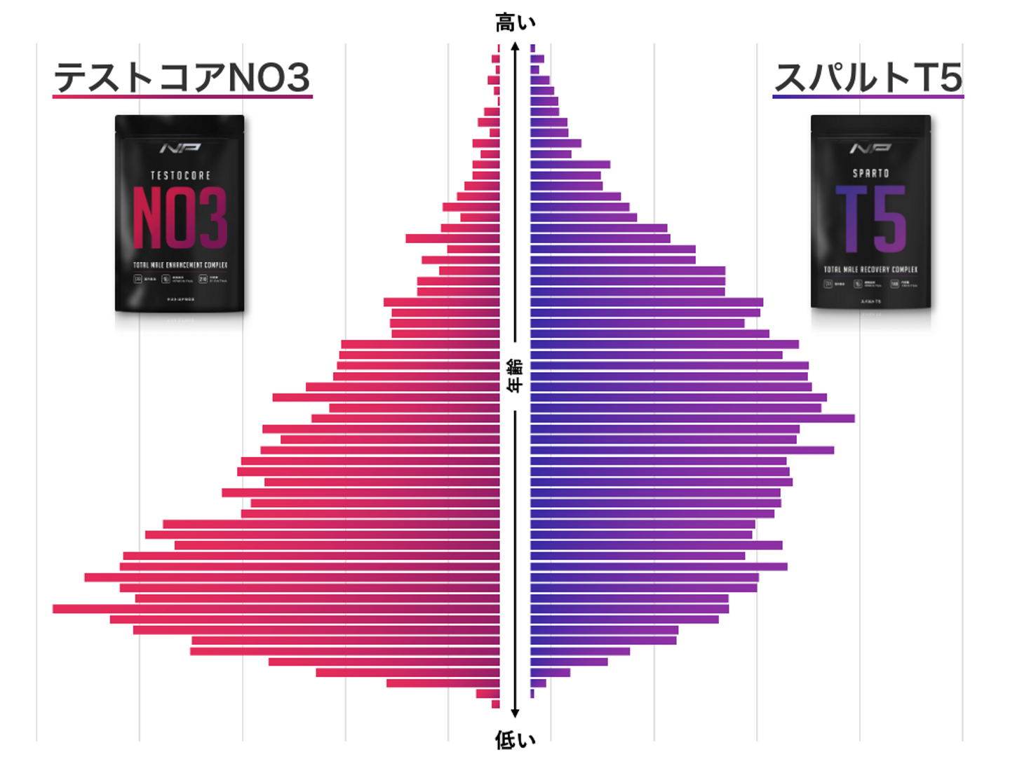 実際に弊社のお客様の年齢層別データでは、テストコアNO3は比較的若年層(20~30代)の方にご利用いただいており、スパルトT5は中高年層(40~50代)のお客様にご利用いただいています。