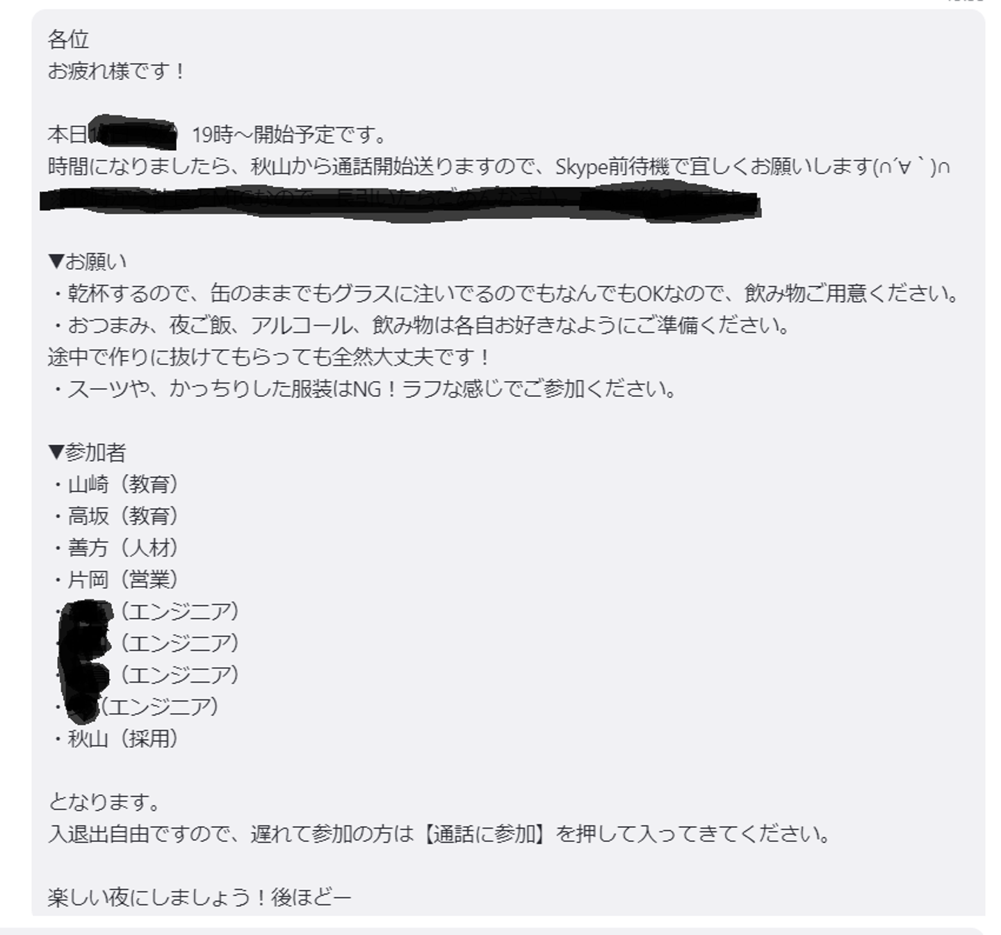 ▼オンライン飲み会の開催にあたりお願いした事
