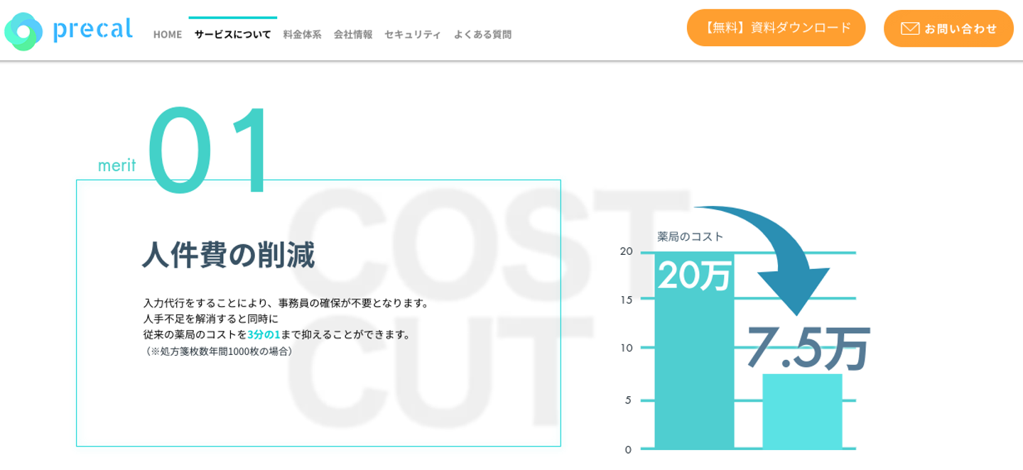 今回作成したLPは、もちろん薬局現場で働く方々に向けたものでもありますが、一番はプレカルの導入を決定する薬局経営層の方々に向けて作成をしました。冒頭に置いた「コストカット」「人手不足の解消」「入力ミス率の低下」この3つのフレーズもターゲット層の興味をいかに引きつけることが出来るか考えて設定したものになります。