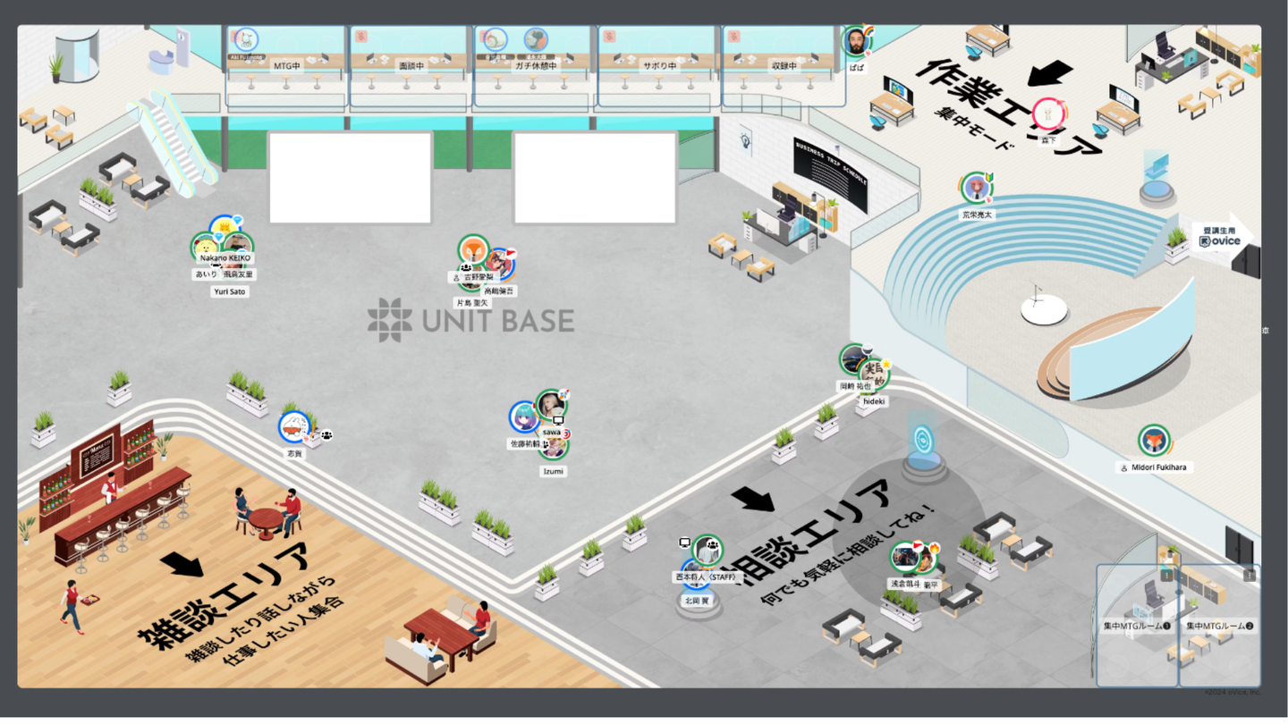 上の画像のように、バーチャルオフィスを活用し、離れていても柔軟にコミュニケーションが取れる環境を整えています。普段の打ち合わせや突発的に確認したいことなどリアルなオフィス空間にいるのと変わらないコミュニケーションができるのもUNIT BASEの特徴です。