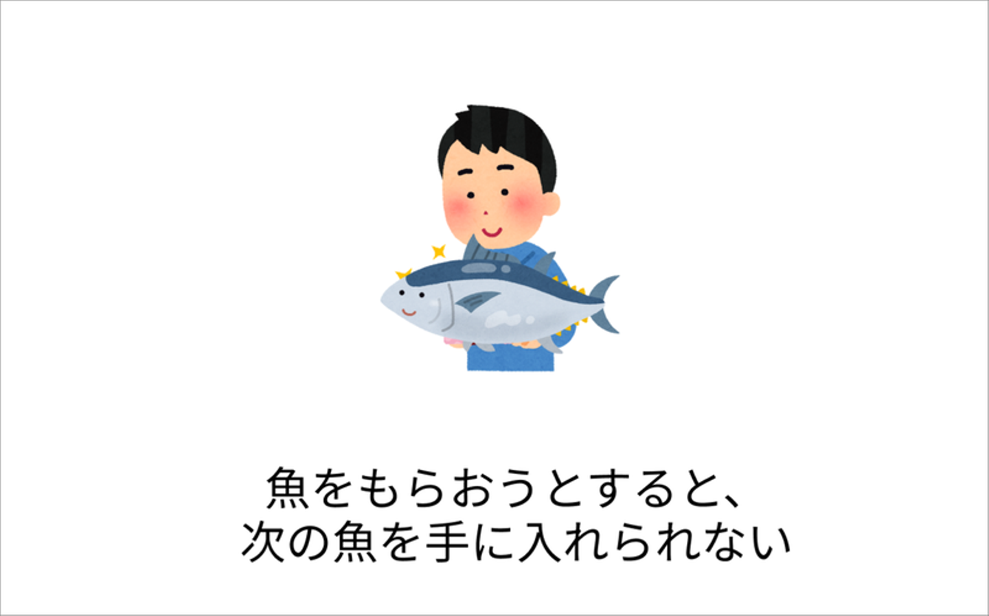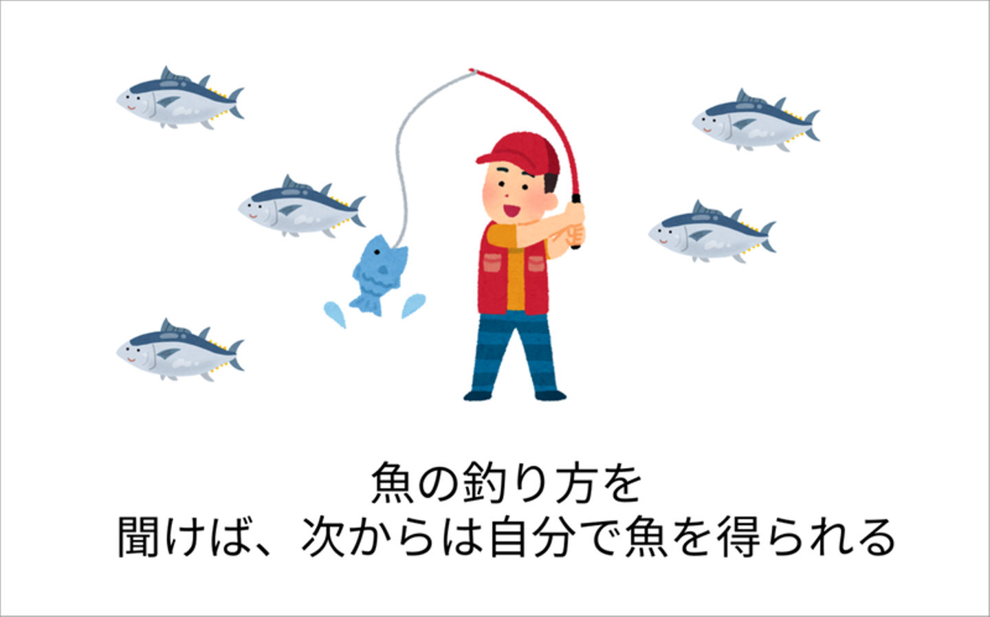 このように、魚の釣り方(汎用的な解決手順)を聞く場合、質問しなくても自分で解決できるようになります。