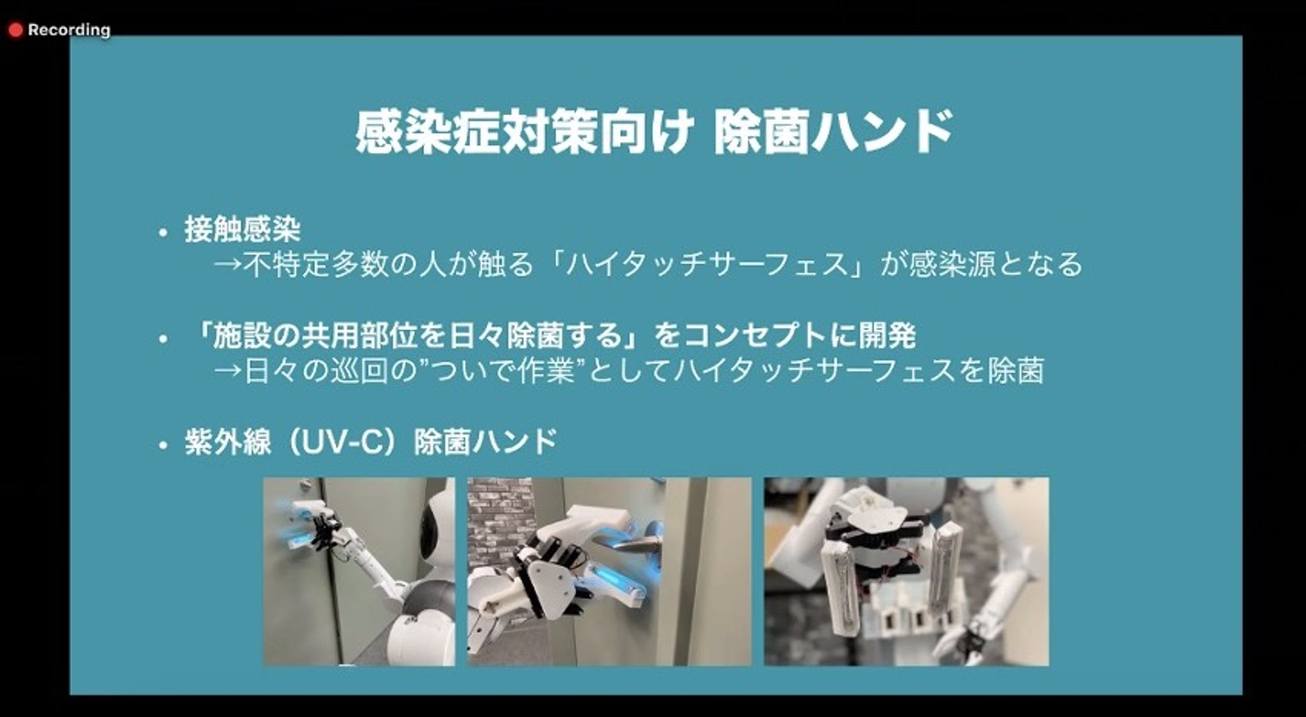 弊社の松井CEOは三番手として登壇。現在取り組んでいるビルメンテナンスの総合的なサービスパッケージの開発について、実証実験の様子をご紹介しながらご説明させていただきました。また、最近リリースした紫外線照射による「ついで消毒」について、海外からの問い合わせが多かったこともあり、開発に取り組んだ経緯をご紹介しました。
