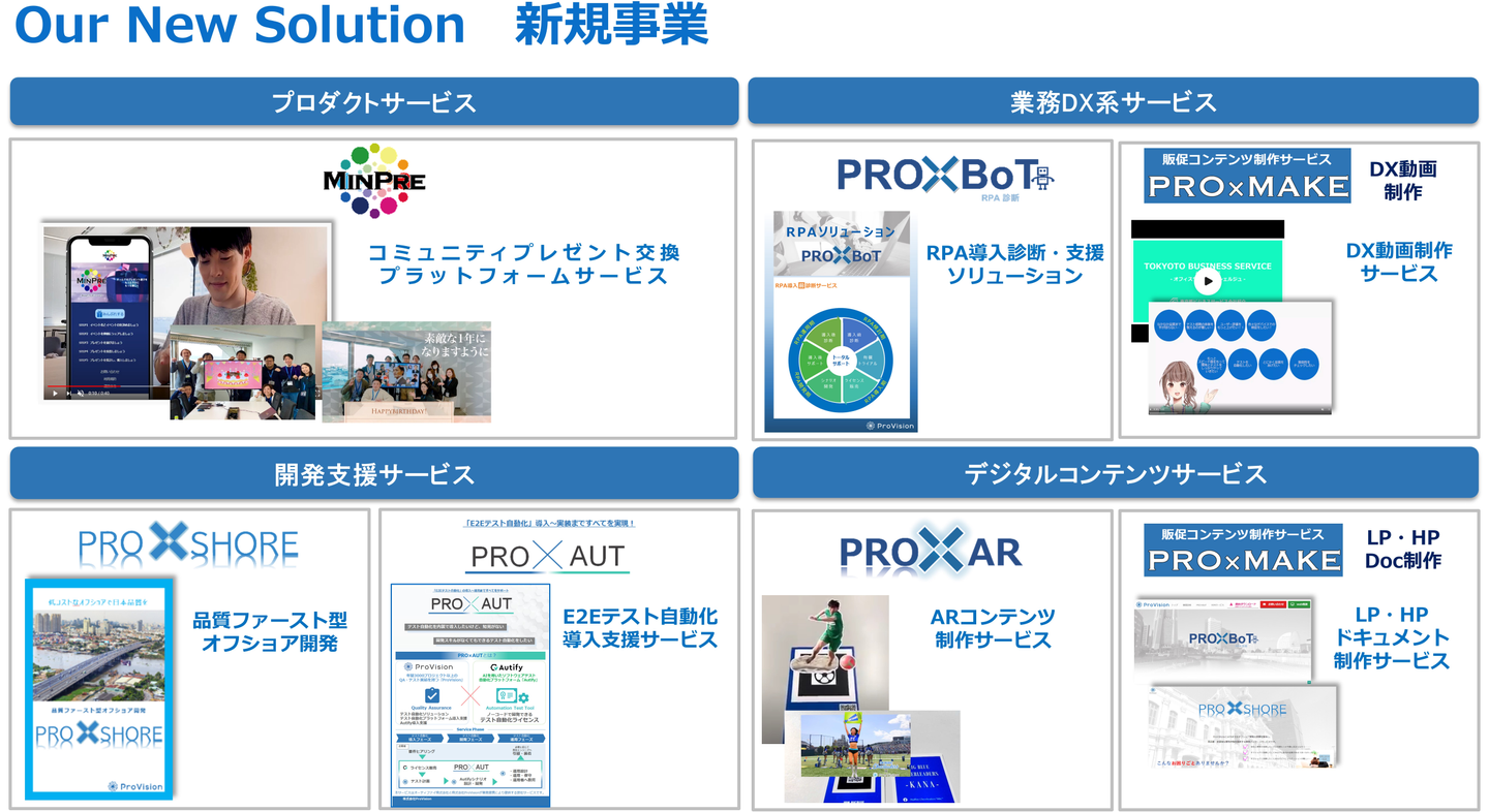 あとはドアノックサービスと呼ばれる、私たちが今まで持っていた技術を商品として転化したもので、営業商材作成サービス「PRO×MAKE」や高品質低価格なオフショア開発パッケージサービス「PRO×SHORE」、あとはオーティファイ株式会社と提携したE2Eテスト自動化導入支援サービス「PRO×AUTO」などがあります。