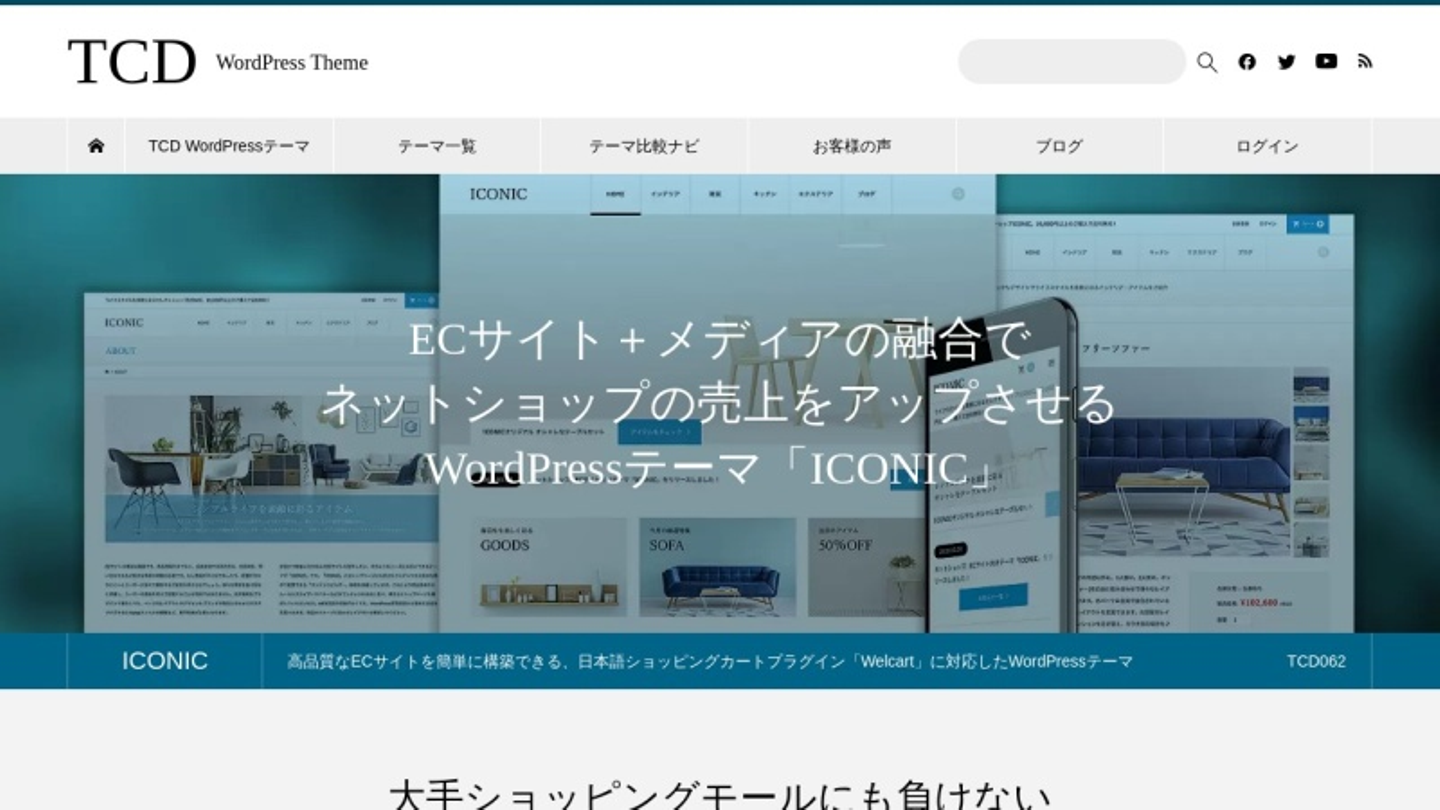 ICONICは高品質なECサイトを簡単に構築できる、日本語ショッピングカートプラグイン「Welcart」に対応したWordPressテーマです。