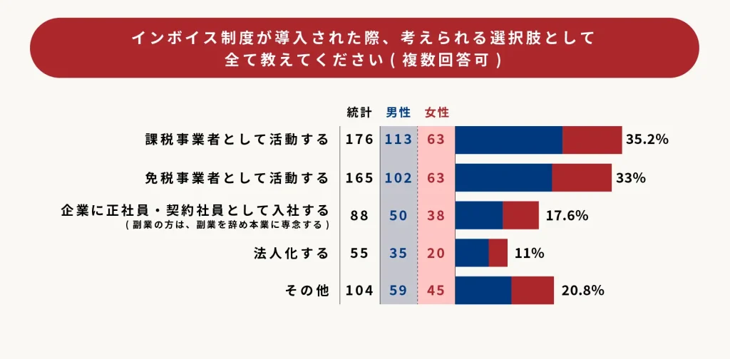 自分が興味ある結果としては、課税事業者としてインボイス発行できるようにするという人と、免税業者のままで活動するという人が、半々くらいという結果です。