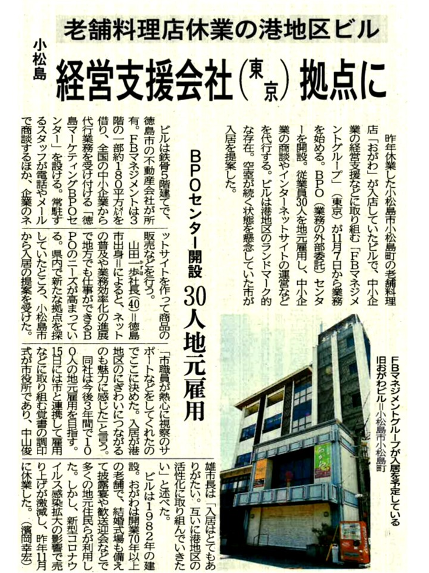 株式会社FBマネジメントグループでは、11月7日より「徳島マーケティングBPO*センター」を開設いたします。従業員30人を地元雇用し、全国の老舗ファミリー企業から依頼を受け、主にインサイドセールス代行業務を展開します。