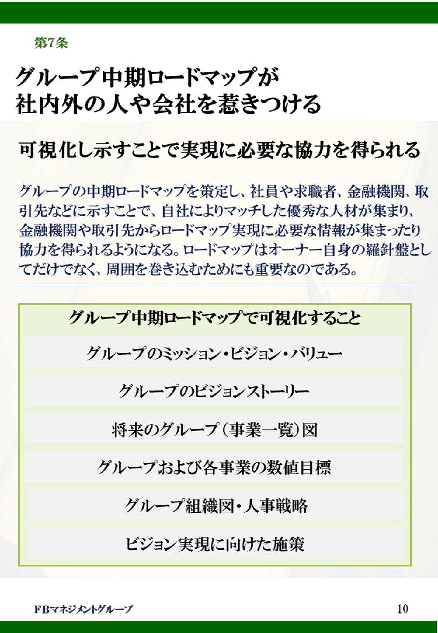 第7条は「グループ中期ロードマップが社内外の人や会社を惹きつける」という点について、解説していきます。