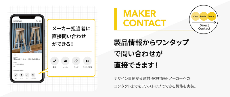 このようなデータは、【TECTURE】がローンチするまでは、事例が掲載された雑誌でみて、グーグルで検索して、メーカーに問い合わせるまでわかりませんでした。それがデザインの事例写真からワンストップでメーカーへの問い合わを可能にしました。