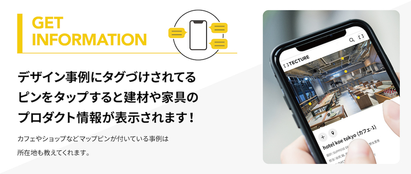 登録されている建築やインテリアなどの事例写真から、その空間でどんなプロダクトが使われているかが一眼でわかります。例えば、飲食店の事例写真であれば、カウンターの椅子や、天井の照明器具、トイレの手洗い水栓といったプロダクトに黄色いピンをうってあり、タップすれば、メーカー名、品番、価格などが画面上に表示されます。