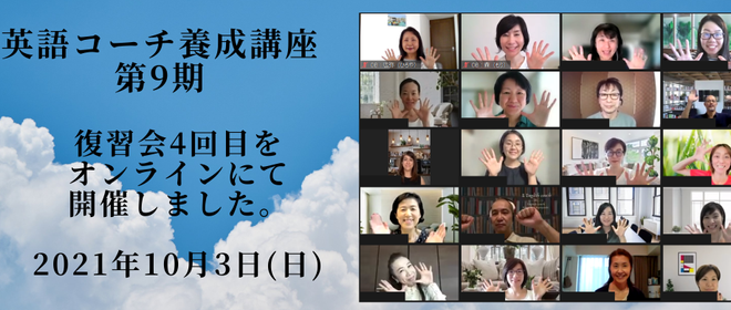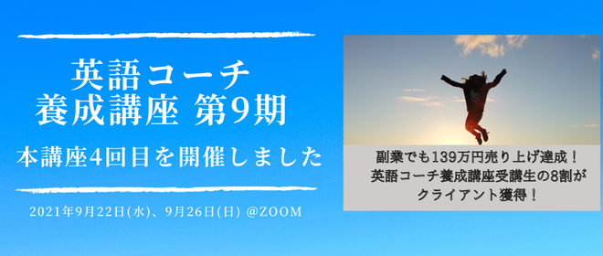 23名の新米英語コーチに先輩コーチからのアドバイス英語学習を継続していくために重要な目標設定とは?●英語コーチ養成講座第4回目復習会詳細URL【開催日程】開催日・開催場所:2021年10月3日(日)オンライン(ZOOM)開催時間:10:00~12:00参加人数:23名【プログラム詳細】今回の復習会は英語コーチングとして独立したばかりの新米英語コーチに対して英語コーチングを初めて実施する際に陥りがちな問題例を挙げ、どのように解決したらよいのかを2名の英語コーチ養成講座卒業生の経験をもとにお話しいただきました。英語を短期間で上達させるためには毎日の英語学習が必須です。しかし、クライアントさん...