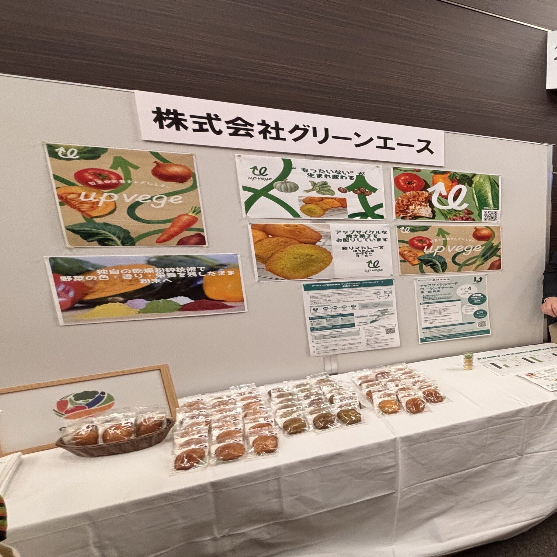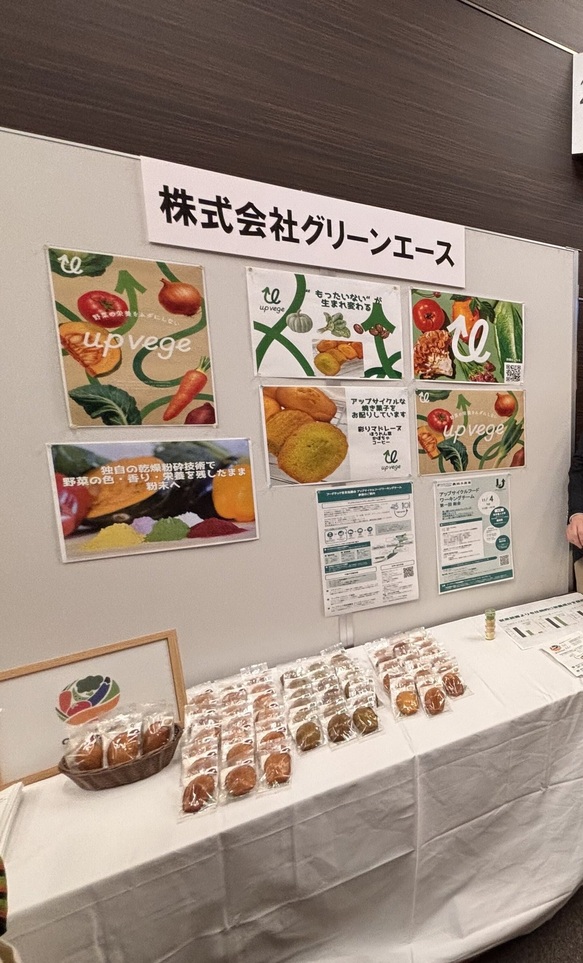 そんな中グリーンエースもブースを出展し、野菜の粉を使ったマドレーヌをお配りしながら、事業の紹介やアップサイクルの取り組みをご説明しました。